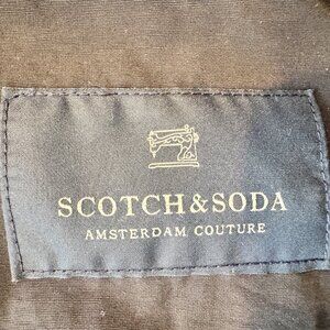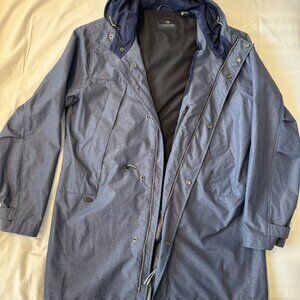 Slate Blue Scotch & Soda Hooded and Lined Raincoat. Zipper and snap closures and drawstring at waist and bottom of coat. Multiple pockets. In great condition. No stains or flaws. Sized at XL but refer to the measurements in photos. It is a "slim" XL