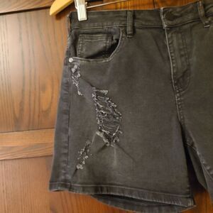 High waisted distressed washed black jean shorts from Scotch and Soda. Zipper fly. Look cute cuffed or uncuffed or could be cut for a raw edge look.
