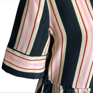 A beautifully green/pink/red pinstripes against a yellow base. This mini hi/lo type of dress features short sleeves; button closures from top to bottom; a waist drawstring; a collared neck and ivory buttons. It is lightweight and has a loose, relaxed look to it. However, you look effortlessly pretty. Retro vibes but modern appeal. This would look amazing with penny loafers or low cut sneakers!