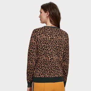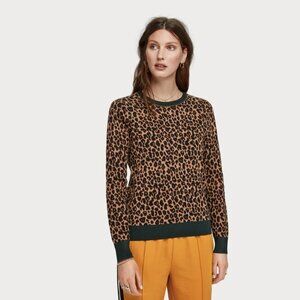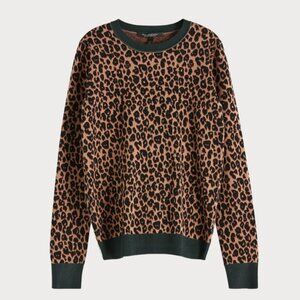 Knitted from soft cotton, this sweater features a bold leopard pattern, a crew neckline, and contrast color rib knitted finishes.