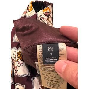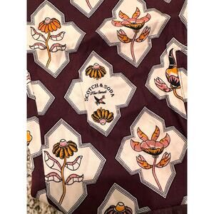 Scotch & Soda Sun Ray Satin Burgundy Floral Print Pleated Straight Leg Pants, size S NWOT. Front pockets. Beltloops. Zipper and clasp front closure. Colorway: burgundy, white, yellow, black. Please see photos for measurements.