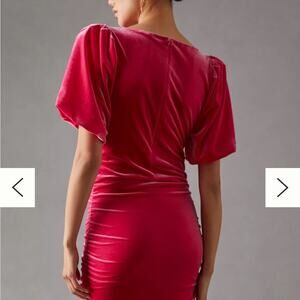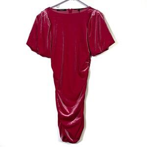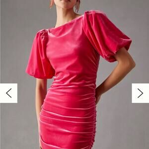 Form flattering dress with puff sleeves. Ruched sides. Soft velvet fabric. Knee length. Hot pink.