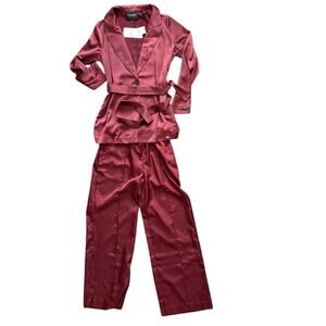 scotch and soda, satin suit set, pajama suit, quiet luxury, coordinated set, women’s matching set, resort wear, belted blazer, wedding guest outfit, wide leg pants, wine color satin, new with tags