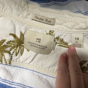Men’s size XL Scotch & soda long sleeve casual button-down shirt. Style is the paradise shirt regular fit. 100% cotton. Flip cuff palm tree design. Good condition, though there is some discoloration around neck and cuffs. Perfect for a tropical beach vacation
