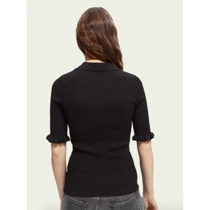 Scotch & Soda dark brown ribbed ruffle sleeve quarter button polo shirt top