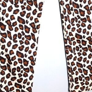 Fun but subtle leopard print pants. Colors of brown and black on an off white background. Slim fit to straight leg at ankle height with a slight high rise.