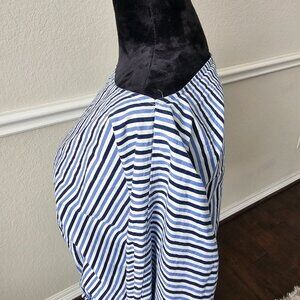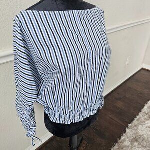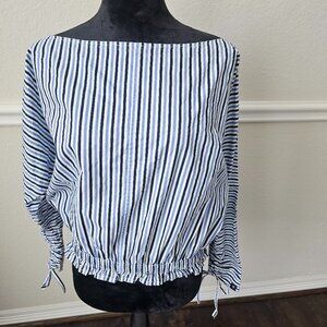 This is an XS Scotch and Soda Women's Blue Stripped Shirt with long sleeves with tied cuffs.