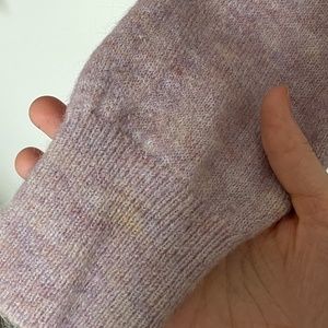 Super soft almost faux cashmere feel (blend in 3rd picture). Two small and light stains on left sleeve (last picture) that could probably be washed out. Fits true to size!