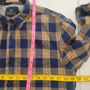 Scotch and Soda Flannel Button Down Shirt Mens S Long Sleeve Blue Gold Plaid. Excellent pre-owned condition with no flaws.