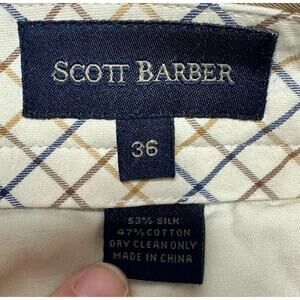 Elevate your wardrobe with these Scott Barber men's chino pants in size 36x29.5. The beige pants are made of a luxurious blend of silk and cotton with a flat front and straight leg style. They feature a zip and button closure with slash pockets and the Scott Barber logo accents on the button and zipper. Perfect for any occasion - from travel to weddings, parties, casual outings, and business meetings - these comfortable pants are a must-have. The pants are dry clean only and are a part of the Scott Barber product line. Add a touch of preppy style to your outfit with these classic chino pants.