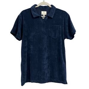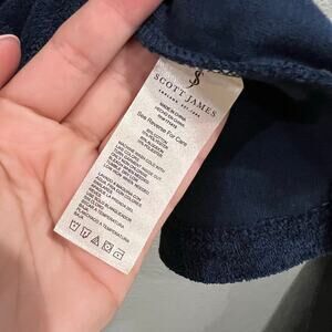 This Scott James French terry v-neck top in navy blue, size Small, is a cozy yet polished wardrobe staple. Made from soft French terry fabric, it offers both comfort and style, perfect for casual outings, lounging, or layering. The v-neckline adds a flattering touch, while the versatile navy color makes it easy to pair with jeans, leggings, or shorts. Excellent pre-owned condition with no flaws.
