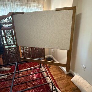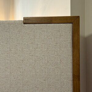 Queen Sized ; Selling because I'm moving unexpectedly, but it's honestly a gorgeous headboard. Comes with original hardware for installation. Link for more product details: https://englishelm.com/products/pulaski-furniture-scott-living-heritage-upholstered-headboard-with-cut-out-design-honey?variant=46441309274279
