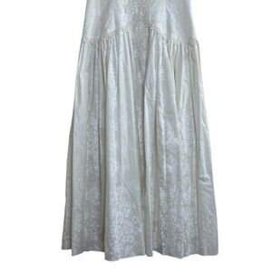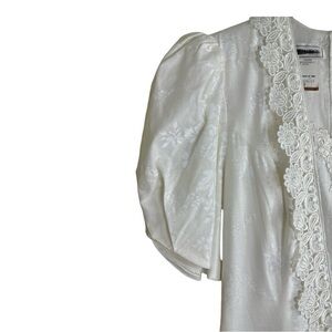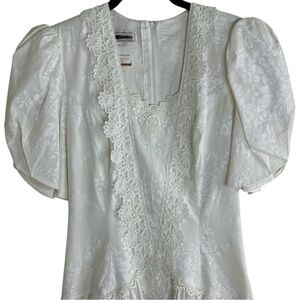 This 1980s Scott McClintock puff-sleeve midi captures romantic vintage style with tulle-lined sleeves, padded shoulders, and a drop-waist silhouette. The crochet lace trim and full skirt create a timeless Cottagecore feel—ideal for weddings, garden parties, or collectors.