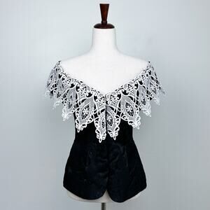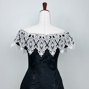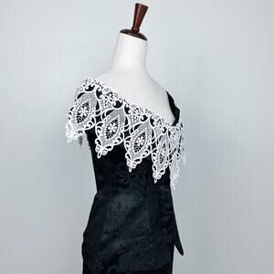 Size 4 Scott McClintock 2-piece set. Black brocade fabric with white lace trim. The top has an off shoulder neckline, a button-up front and boning in the bodice for structure. Skirt is high-waisted with a back zipper and vent. Please refer to the measurements listed below to ensure a good fit! Great condition!