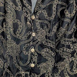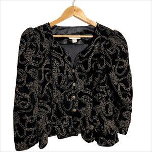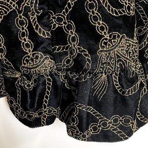 Vintage black velour jacket with glittery chain and pendant pattern by Scott McClintock. Four button front. Shoulder pads. Long sleeves. Princess seams. Ruffle around the hem. Fully lined. Gold sparkles have with a sprinkle of rainbow glitter that doesn't really show up in photos. Originally part of a set.
