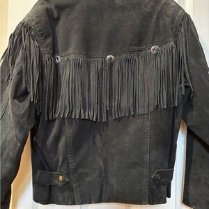Womens size medium but fits larger up to size XL! Vintage black leather with fringe on front and back, western metal details, snap closures on front, wrists, and at waist for cinching! Sleeve length is 23 inches! Bought it used, worn once to a Stevie Nicks concert! Perfect for elevating any fall/winter look or costume! Open to offers!
