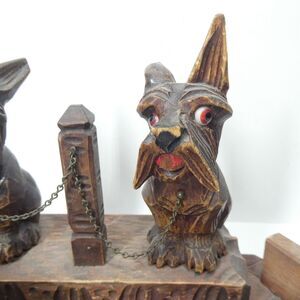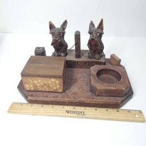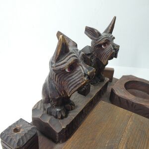 Vintage desktop set featuring a pair of scottie dogs. Interesting carved design, with eyes that appear to be glass. It measures nearly 12 inches wide, and 6.75 inches tall.