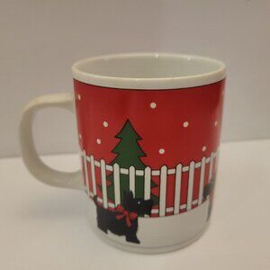 This ceramic mug showcases a charming Christmas scene with Scottie dogs, a festive wreath, and evergreen trees. Its vibrant design enhances holiday cheer and is ideal for enjoying warm beverages during the winter season. The sturdy handle ensures a comfortable grip, while the mug's durable construction promises longevity.