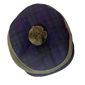 Made in Scotland for Highland Home Industries of 100% Wool. Blue and green plaid with Pom Pom on top and knit lower.