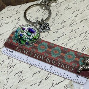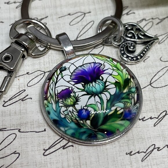 This Scottish Thistle Keychain by FANCY FOX BOUTIQUE is a unique and charming accessory perfect for women who appreciate intricately designed pieces. The keychain features a resin cameo of a thistle design in purple, green, and silver tones, making it a versatile accessory that can complement a variety of outfits. This multifunctional keychain also doubles as a necklace with a claddagh heart, adding an extra touch of elegance to any ensemble. Ideal for those looking for a stylish and meaningful gift, this keychain embodies a touch of Irish charm and flair.