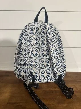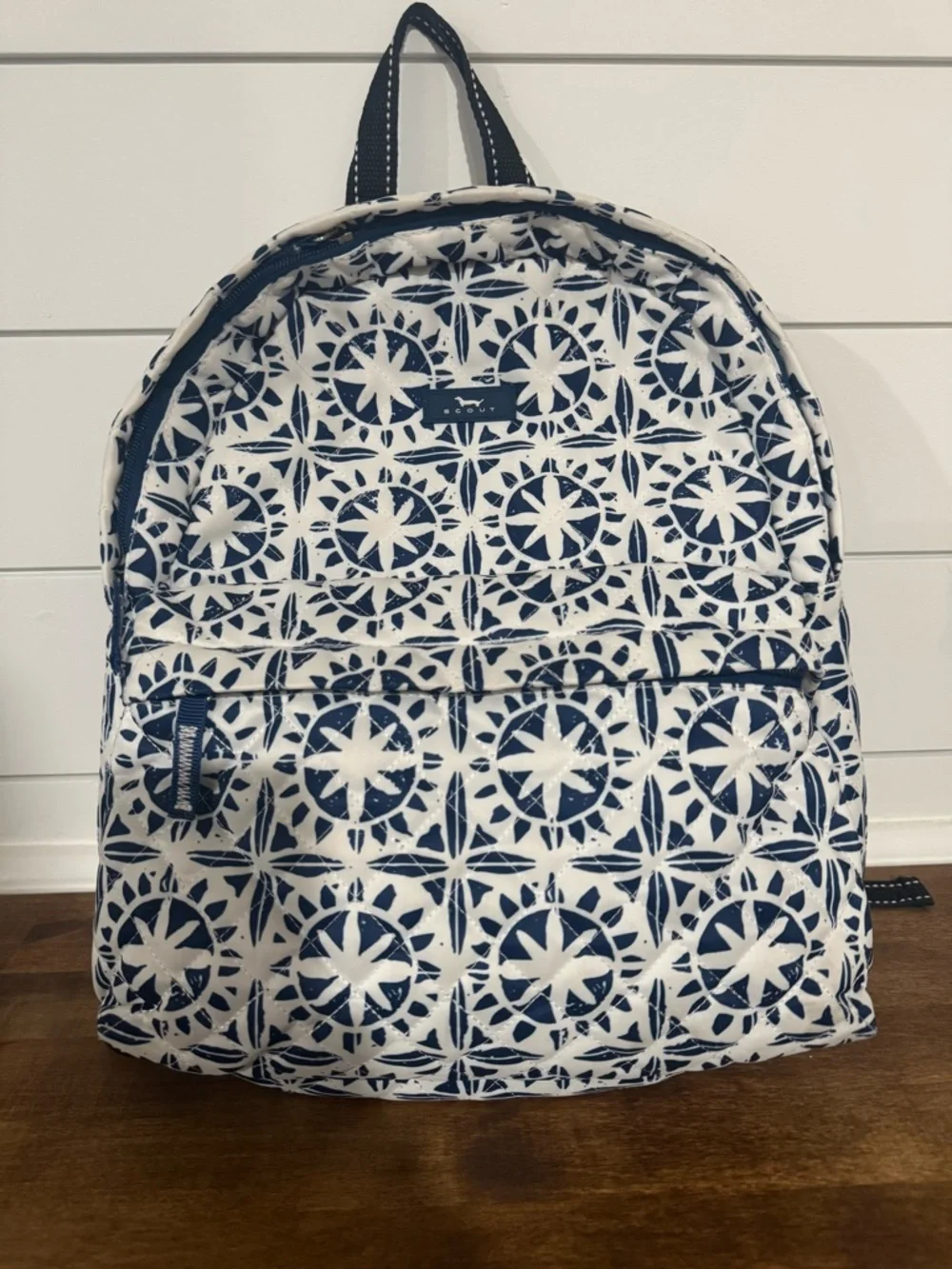 Scout navy and white patterned backpack. Bold geometric star print. Front zip pocket and top handle. Lightweight and versatile for everyday use.