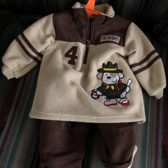 tan & brown pull over jacket & pants both pieces feel like fleece, soft, pants are lined same material jacket is made out of, pants also have a pocket on both legs half way down with Velcro flap