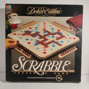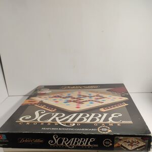 The Scrabble Deluxe Edition from 1989 by Milton Bradley features a vintage mahogany game board with a rotating turntable for added convenience. This classic board game is perfect for players of all ages, with a recommended age range of 3 years and up. With a strategic theme and the ability to accommodate 2 players, this deluxe edition Scrabble game is a timeless favorite for family game nights and gatherings. Made in the United States, this set includes all necessary tiles and is a must-have for any board game collection.