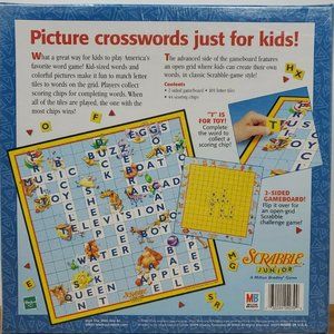 Introducing kids' first Scrabble game. Parents have always loved getting kids into the Scrabble game as early as possible, given the educational value and fun of word games. This Scrabble Junior game is easy for kids to play, and lots of fun. One side of the board has you match letters to form words. The other side has you building your own words.