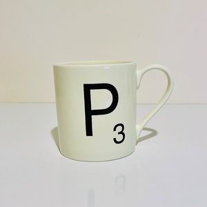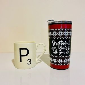 Scrabble Letter P Mug and Holiday Travel Mug Bundle. One (1) Scrabble Letter "P" mug designed and produced by Wild & Wolf Ltd Date: 02/2013. Dishwasher and microwave safe. Excellent pre-owned condition - no chips or cracks. One (1) Happy Holidays Theme Travel Mug with Christmas sweater design. 20 fl oz capacity. Hand wash only. New in box.