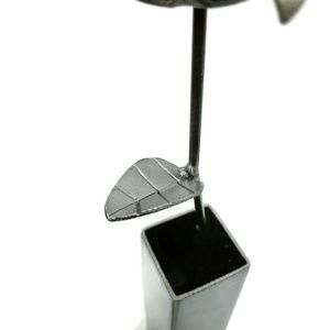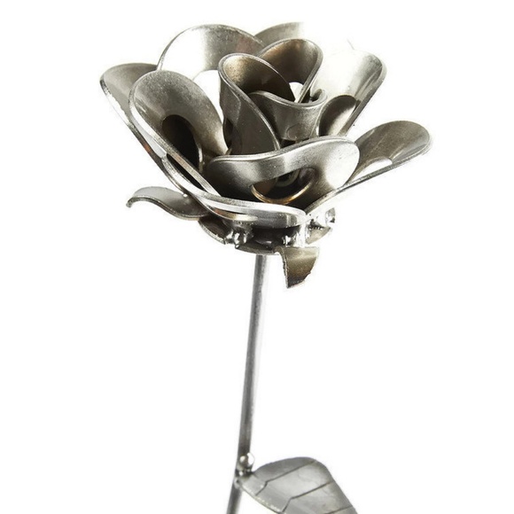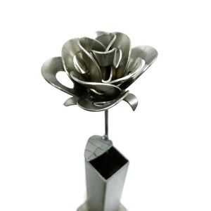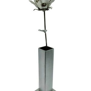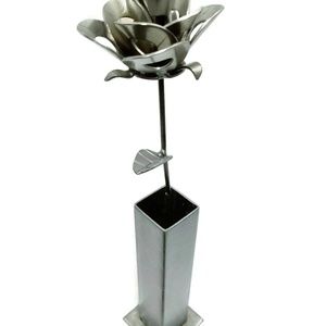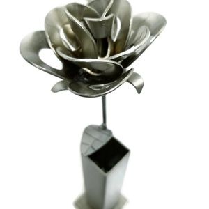 The handmade welded metal rose with a vase creates the perfect gift. This is one of our up-cycled roses and a vase made from recycled materials including washers, tubing, and wire welded together creating beautiful art. Each rose is an individual and a little different all created from the same materials. The washers are all hand bent and welded together to create a beautiful welded art rose that will never die.