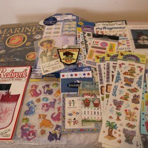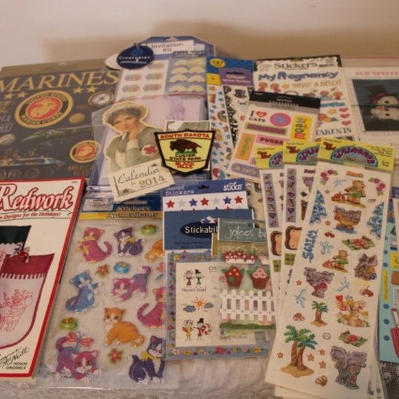 Scrap booking, stickers, embellishments and misc. craft Lot for Sale. Here is list what you get: 1.) Merry Redwork Iron on Book never used (New); 2.) Marine Stickers - New in Package; 3.) 2014 Victorian Nurse Calendar - Magnetic; 4.) South Dakota Custer State Park Patch; 5.) Set of (3) Creatables Invitation Kits - New (24 total invitations); 6.) Assorted stickers for scrap booking and crafts (New in Packages - some doubles) 17 packages; 7.) (4) Sewing Craft Patterns - Frosty 17" Centerpiece, BeBee Bunny Pattern, Santa Pattern Door Knob Holder, and Full-Size Pattern for Halo, Wings, Clothes for 22" Angel. Everything sold as a lot. Great for kids, teens, or adults doing scrap booking, crafts, make cards, sewing, etc!!