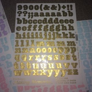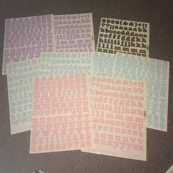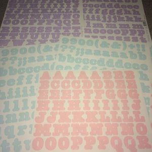 Bundle of 9 sticker sheets of letters for scrapbooking. Colors include baby blue 2 sheets of lower case letters and symbols, baby blue 2 sheets of capital letters and numbers. 1 purple sheet of capitals and numbers, 1 purple sheet of lower case letters and symbols. Same for pink. And one sheet of lower case and symbols in gold. NEW!