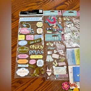 This is a bundle of scrapbooking stickers. Most are new in original packaging, but some are open or partially used.