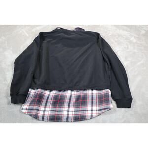 Color: Black sweatshirt body with gray/black/red plaid collar and hem