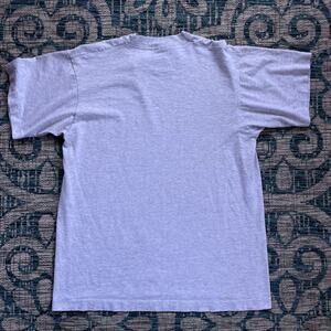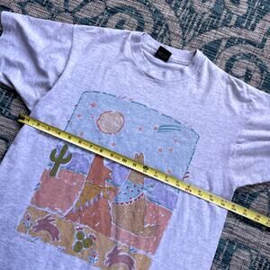 Step back in time with this authentic vintage T-shirt from the 1990s, featuring a unique and colorful graphic of two coyotes and two rabbits in a desert scene. The coyotes, with their detailed patterns, appear to be howling at the moon under a starry sky, with a cactus on the side, a depiction reminiscent of the "Wild Things" style. This shirt is made by Screen Stars Best, a popular and sought-after brand from the era, known for its soft and comfortable 50/50 cotton-polyester blend. The shirt is a classic gray heather color and features a ribbed collar and short sleeves. A must-have for vintage collectors and lovers of desert or southwestern-themed apparel.