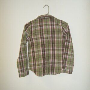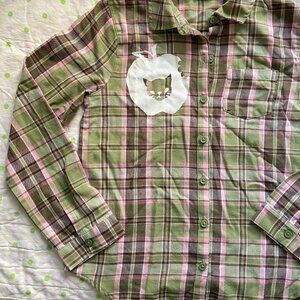 original cat apple in white on a long sleeve green, pink, brown and white plaid long sleeve button down top Screenprinted by me