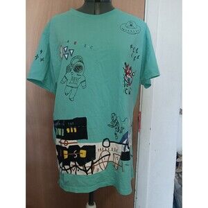 The Screenshot Brand Men's Teal Space Graffiti Animation Hiphop T-shirt in size Large is a stylish and comfortable piece of clothing for men. Made of cotton material, this shirt features a crew neck and short sleeves, making it perfect for all seasons and specifically ideal for the summer season. The shirt is machine washable, making it easy to care for and maintain. With its unique teal color and eye-catching space graffiti animation design, this T-shirt is sure to make a statement for fans of hip-hop and animation.