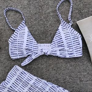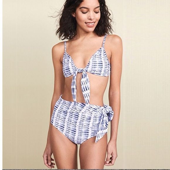 Triangle scoop neck top with tie detail. High waisted full coverage bottom with side tie. Fits true to size. Size Small fits 4/6