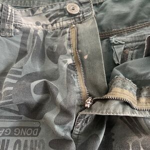 very cool and fashionable long cargo Bermuda shorts with script camo print , lots of pockets and details , nice colors , Xl - waist 20” , Inseam 14” New