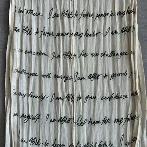 Fabric with black script print on cream background. Perfect for crafts or decor.