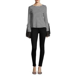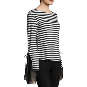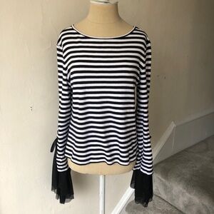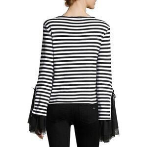 Scripted Cotton Striped Long Tulle Bell Sleeve Top