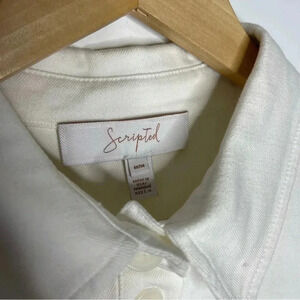 Elevate your wardrobe with this structured ivory denim jacket by Scripted. Featuring a flattering peplum silhouette and dramatic bell sleeves, this button-up piece is both feminine and bold. Designed with two front flap pockets and shoulder epaulets, it blends utilitarian style with chic tailoring. Made in the USA from a comfortable stretch blend.