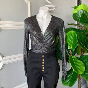 Scripted Metallic Bodysuit Long-Sleeve Black Silver Size Medium