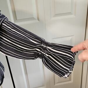 One shoulder top. One sleeve. Sleeve has smocking part way down. Made in USA. Viscose blend. One very faint spot (see pics). Overall, in very good condition.