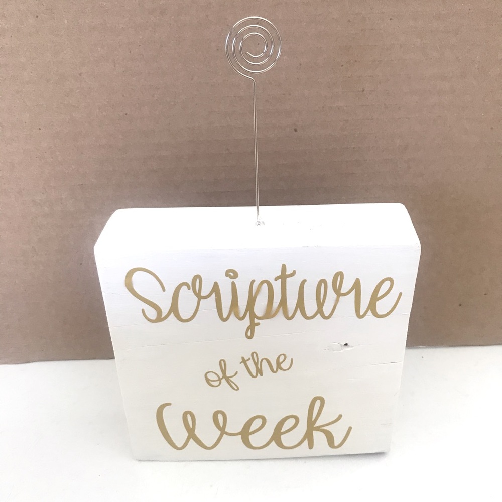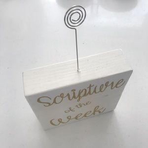 Painted White and gold wood block Scripture of the week display stand. Super cute . Measures about 6”