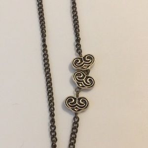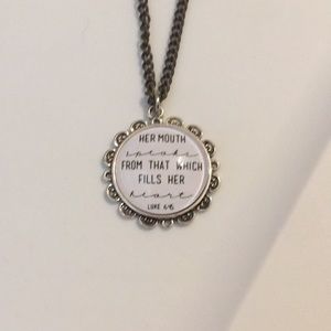 Reads “ Her mouth speaks from that which fills her heart Luke 645. Bronze chain with heart details and pendant at the bottom