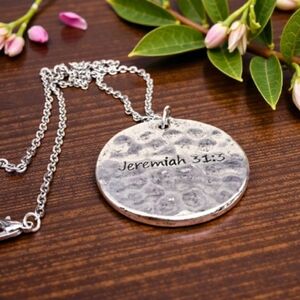 π Jeremiah 31:3 pendant and silver tone chain necklace.