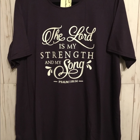 The Lord is My Strength and My Song, Psalm 118:14.... Beautiful Scripture Shirt is Dark Royal Purple and has a round neck. Fabric is Rayon and Spandex. So so soft.