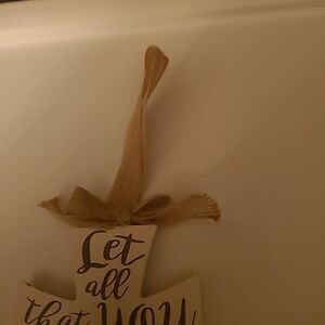 Pre-owned in good condition. Six inch cross with burlap ribbon with the scripture 1 Corinthians 16:14 Let all that you do be done in Love.