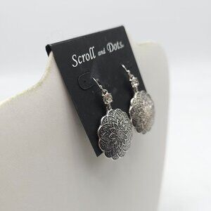 Scroll And Dots Silver Mandala Drop Earrings With Rhinestone Accents 2 Inches